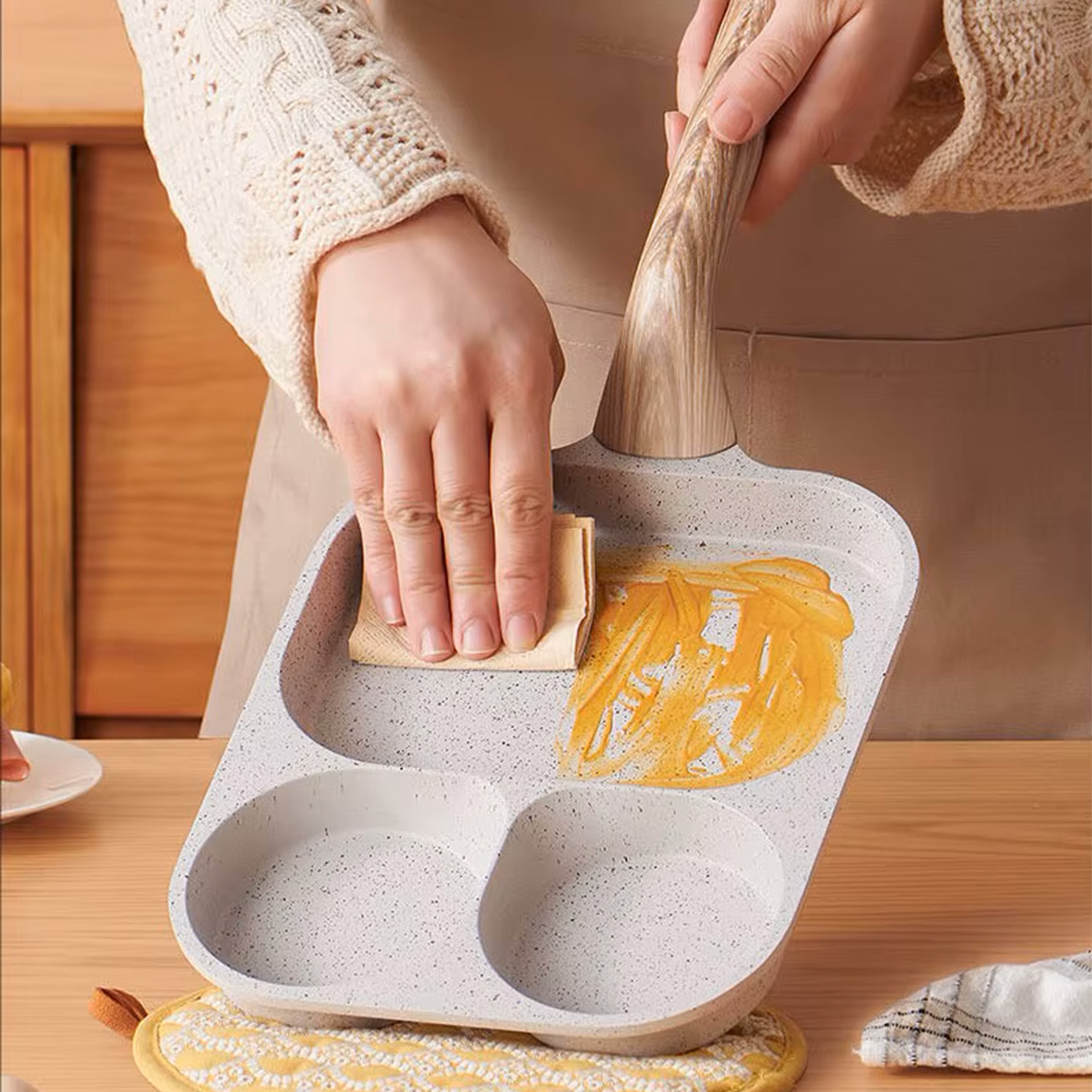 The Ergonomic Handle Ensures Safe, Comfortable Control, While Its Compact, Lightweight Body Makes Storage Simple, And The 3-In-1 Multi-Section Design Lets You Cook Eggs, Pancakes, And More All At Once Without Mixing Flavours.