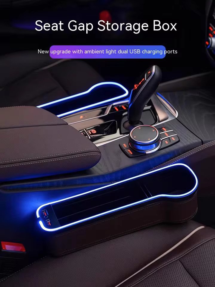 A SLEEK MULTIFUNCTIONAL ORGANISER THAT ELIMINATES CLUTTER, ADDS LED AMBIENCE, KEEPS ESSENTIALS WITHIN REACH, AND CHARGES YOUR DEVICES ON THE GO WITH CAR SEAT CREVICE STORAGE BOX USB CHARGING SEAT GAP SLOT.